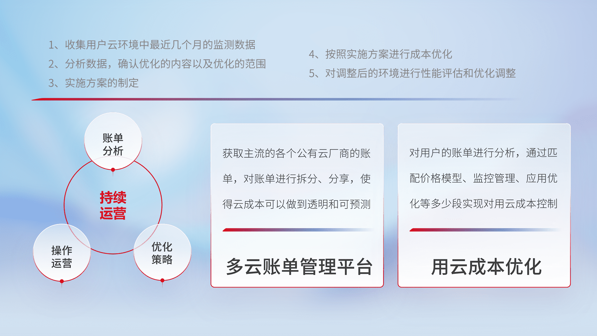 通过多云纳管,,,,以统一的资源数据模型把客户的云资源进行抽象和封装,,,进而实现对多云资源的统一操作,,,,保障云资源管理的可靠性、、、、稳定性与可用性。。。量身定制化运维内容,,,,配置、、、开发运维、、、、补丁管理、、、、备份、、、监控、、认证和访问管理、、、审计和日常巡检等,,,,保障在用云过程中的可靠度,,稳定度以及高可用率。。。