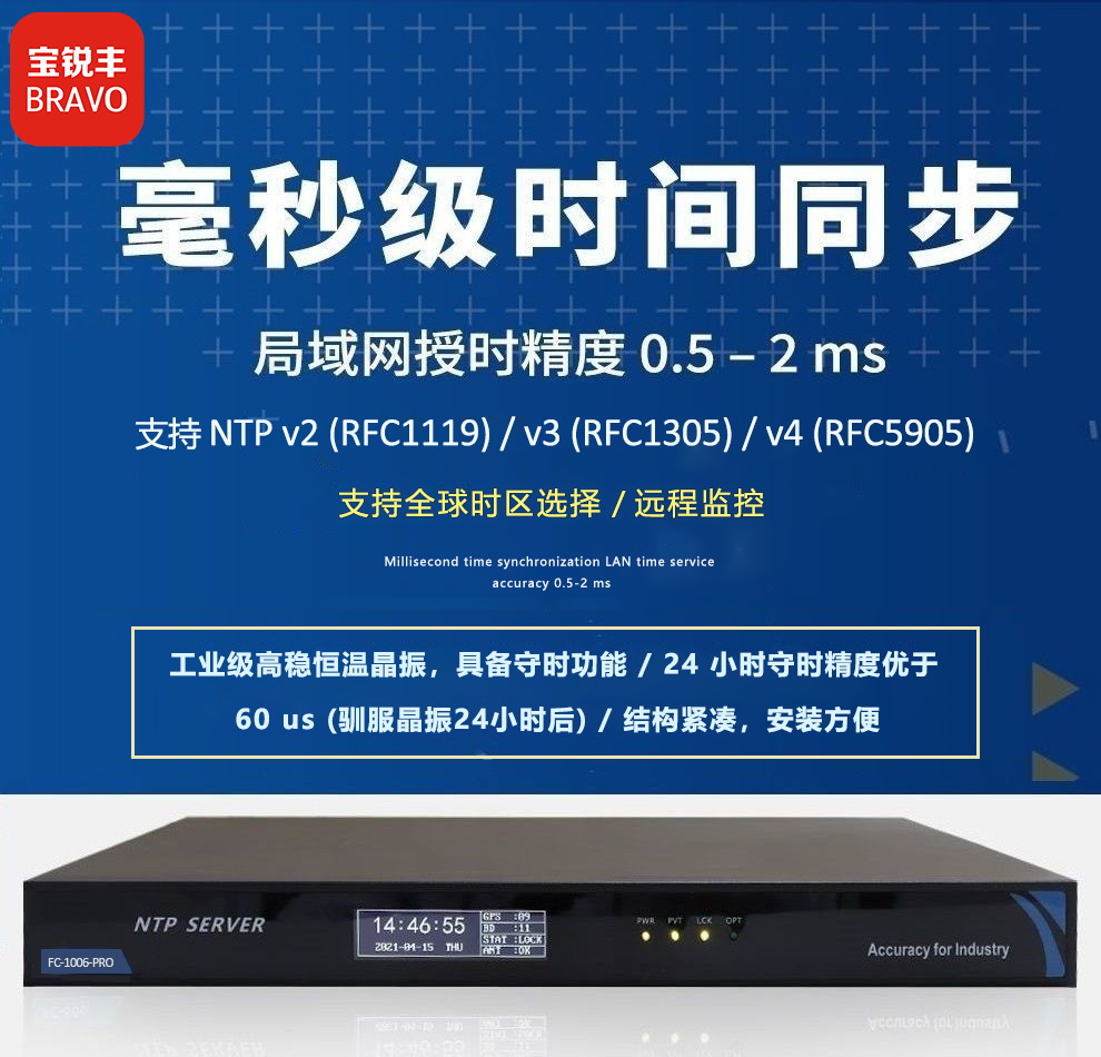 近日,,,,我司推出了一款纯北斗网络授时服务器FC-1006-BD,,,,采用了获得工信部认证的纯国产单北斗专业型授时芯片,,,支持SNTP和NTP协议,,满足多场景应用。。。...